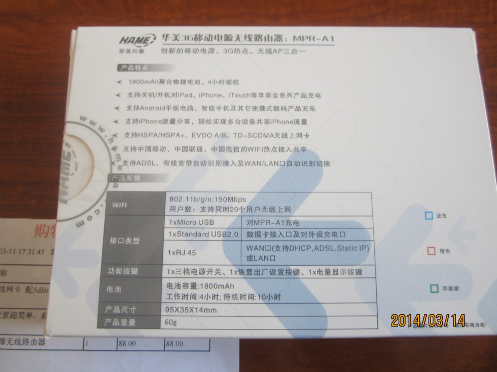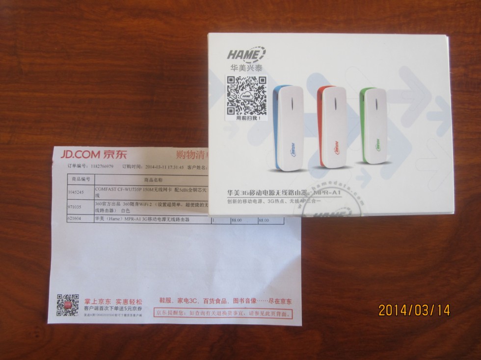 刚在京东买的,全新未拆华美(Hame)MPR-A1 3G移动电源无线路由器!